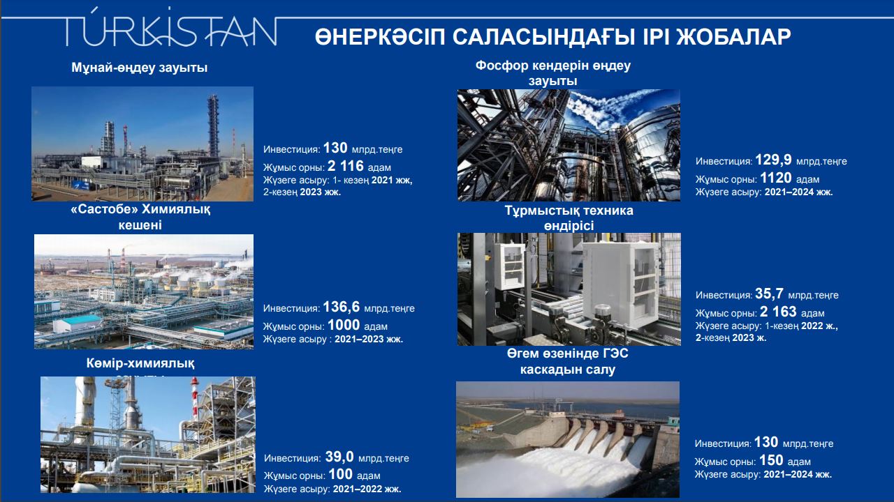 Вместе с тем, в индустриальных зонах Туркестанской области реализуется 60 проектов на общую сумму 41 млрд тенге, которые позволят создать более 4 тысяч рабочих мест. В этом году планируется реализовать 6 проектов на сумму 1 865,3 млн тенге с созданием 683 рабочих мест. На сегодняшний день в специальной экономической зоне «TURKISTAN» запущено около 50 инвестпроектов на сумму 480 млрд тенге. Более того, объем валовой промышленной продукции в этом году планируется довести до 565 млрд тенге», – сказал он.