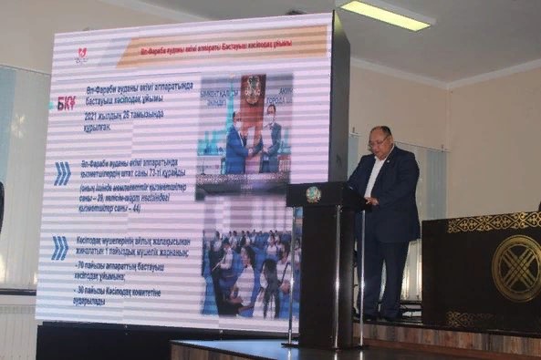 Кезекті кездесу өткізіліп отырған Шымкент қаласының Әл-Фараби ауданы әкімінің аппараты мемлекеттік мекемесінің бастауыш кәсіподақ ұйымы 2021 жылғы 26 тамызда құрылып, құрамында 73 адам, оның ішінде мемлекеттік қызметшілер саны – 29, келісім-шарт негізіндегі қызметшілер саны – 44 болып, барлығы 100% кәсіподақ мүшелігіне кірген.