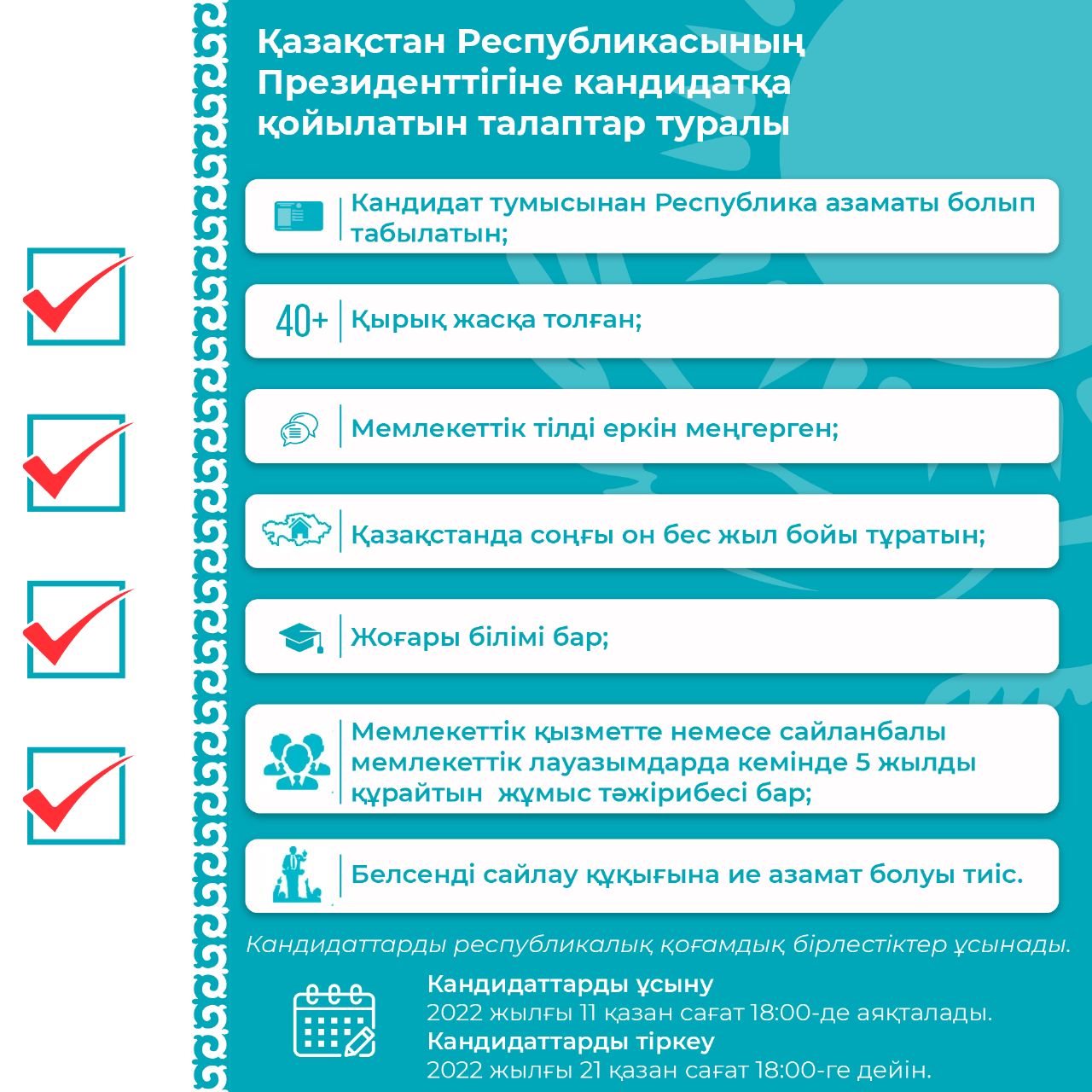 | Президенттiкке кандидатты облыстардың, республикалық маңызы бар қалалардың және Республика астанасының кем дегенде үштен екiсiнiң атынан теңдей өкiлдiк ететiн сайлаушылардың жалпы санының кем дегенде бiр процентi қолдауы тиiс. |