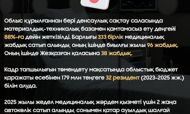 Ағымдағы жылы 6 медициналық нысанда жөндеу жұмыстары басталды, оның ішінде Жезқазған қаласының 3 нысаны (емхана, медколледж, облыстық көпбейінді аурухана). Кадр тапшылығын азайту үшін облыстық бюджеттен 32 резидентке 179 млн теңге бөлінді. Жаңа келген 25 медицина қызметкеріне 170 млн теңге көтерме жәрдемақы төленді, 15 дәрігер қызметтік үймен қамтамасыз етілді (Жезқазғанда – 5 дәрігер).