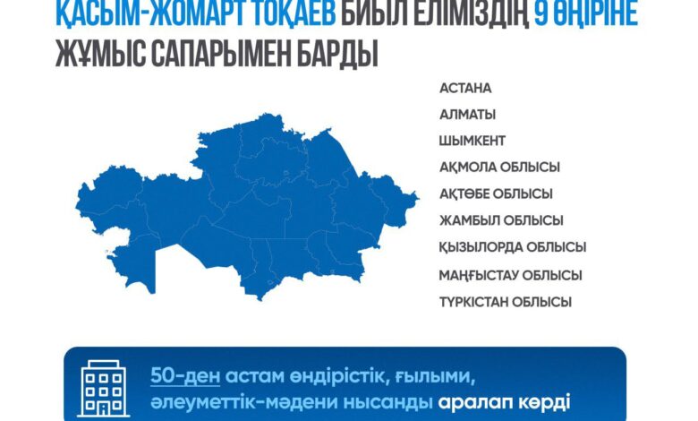 Қасым-Жомарт Тоқаев биыл еліміздің 9 өңіріне жұмыс сапарымен барып, 50-ден астам өндірістік, ғылыми, әлеуметтік-мәдени нысанды аралап көрді.