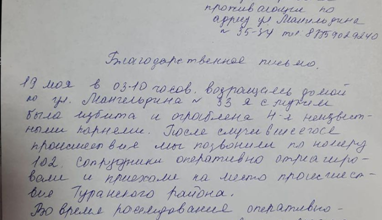 Жәбірленушілер полиция департаменті бастығының атына алғыс хат жазып, жедел жұмыс үшін ризашылықтарын білдірді