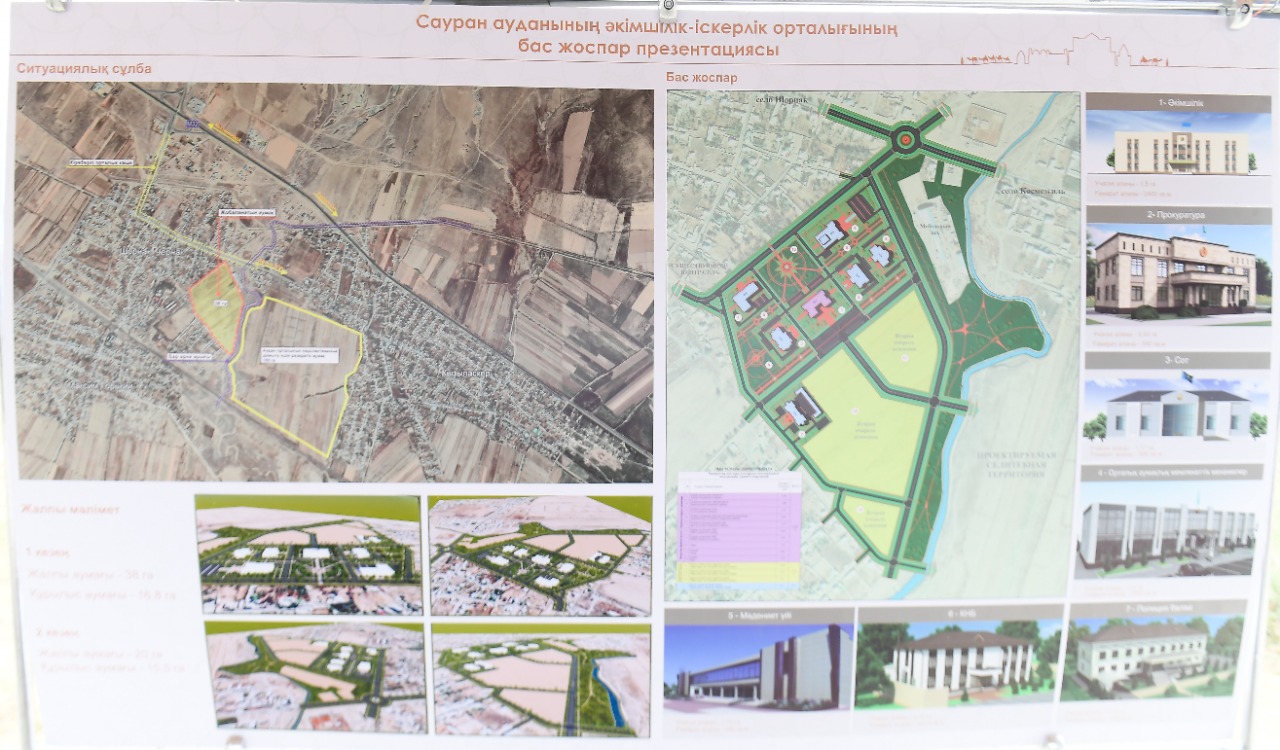 Акиму Туркестанской области Умирзаку Шукееву презентовали Генеральный план административно-делового центра в новом созданном Сауранском районе. На площади около 60 га возведут административные здания, государственные учреждения, районный Дом культуры, парки, скверы и многоэтажные дома. Масштабный план работы состоит из двух этапов. Главе региона также доложили о работе по подведению инфраструктуры к району.