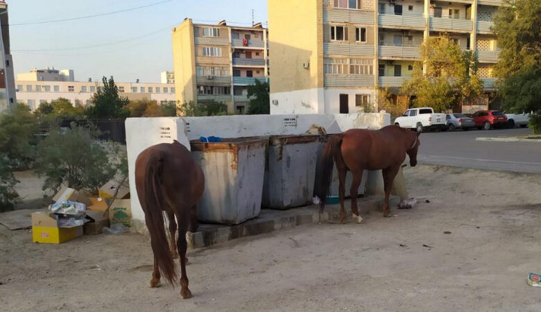 Актауские лошади ищут еду в мусорных контейнерах