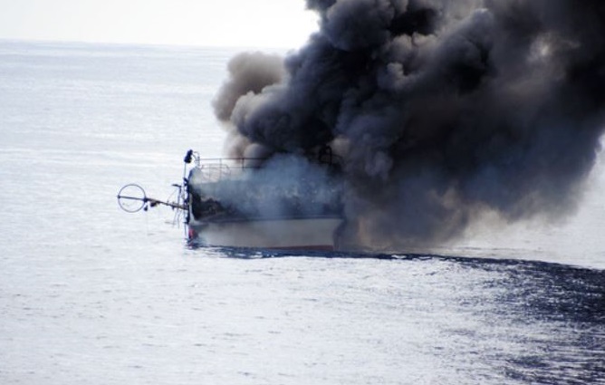 По данным The Asahi Shimbun, на судне начался пожар, из-за чего члены экипажа бросились в море.