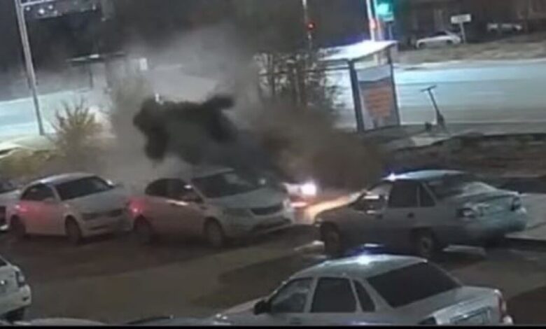 В соцсетях появилось видео, как водитель совершает резкий маневр, автомобиль врезается в остановку и, подлетев, падает на стоянку, повреждая другие автомобили.
