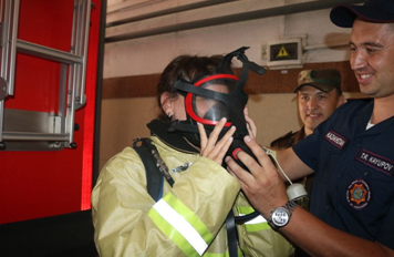 Журналистерді өрт сөндіру бөлімшелерінің жұмысымен таныстыру жауынгерлік киім киюден басталды.Мұндай жабдық өрт сөндірушіні жоғары температурада жұмыс істегенде қорғайды. Кәсіби өрт сөндірушілер бір минут ішінде жауынгерлік киімді киіп, көлікке мініп, шақыртуларға шығады. Содан кейін журналистер өздерін өрт сөндірушілер сияқты сезіне алды, олар шынымен де шеберлік пен күшке мұқтаж толық жауынгерлік жабдықты киді.