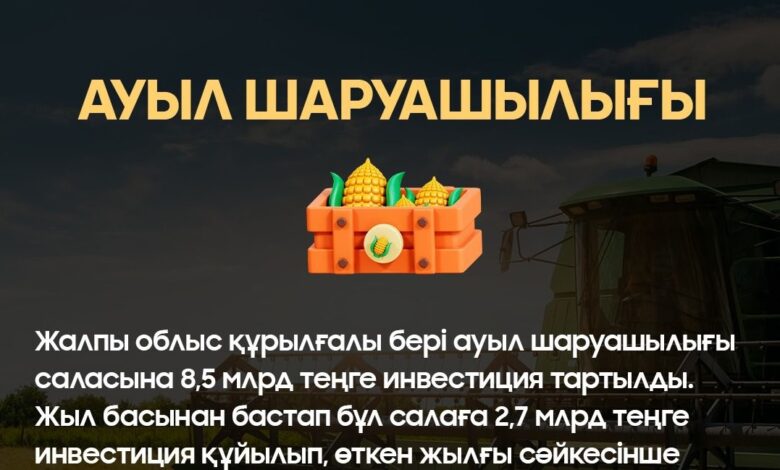 Жалпы облыс құрылғаннан бері ауыл шаруашылығына 8,5 млрд теңге инвестиция тартылса, жыл басынан бері салаға 2,7 млрд теңге инвестиция құйылып, 46 пайызға өсім тіркелді.